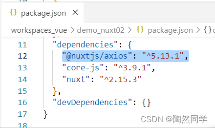 <span style="background-color:#f8f8f8"> <span style="color:#aa1111">"dependencies"</span>: { <span style="color:#aa1111">"@nuxtjs/axios"</span>: <span style="color:#aa1111">"^5.13.1"</span>, },</span> -