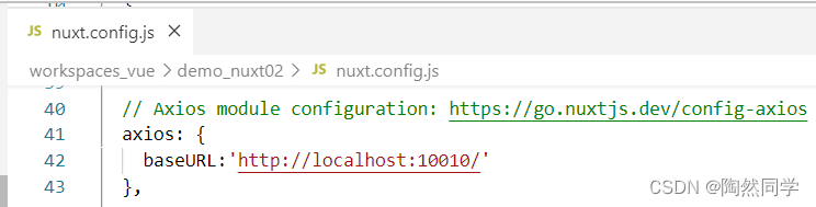 <span style="background-color:#f8f8f8"> <span style="color:#aa5500">// Axios module configuration: https://go.nuxtjs.dev/config-axios</span> <span style="color:#000000">axios</span>: { <span style="color:#000000">baseURL</span>:<span style="color:#aa1111">'http://localhost:10010/'</span> },</span>