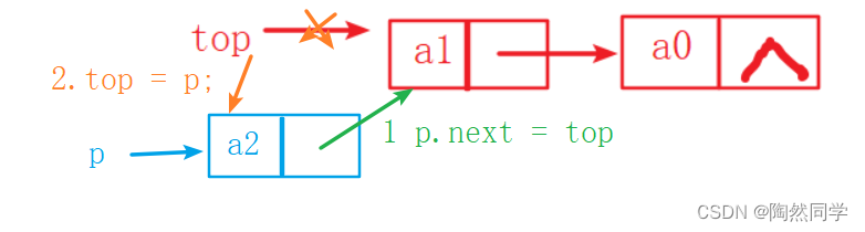 p.next = top;               // 1.p的指针域指向栈顶元素