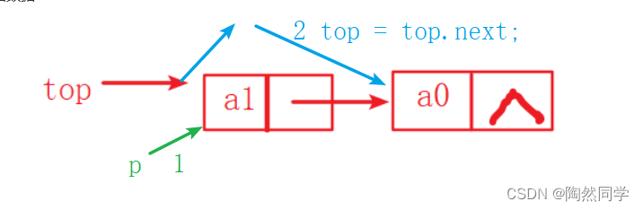 top = top.next;         // 2 将top指向栈顶的下一个元素
