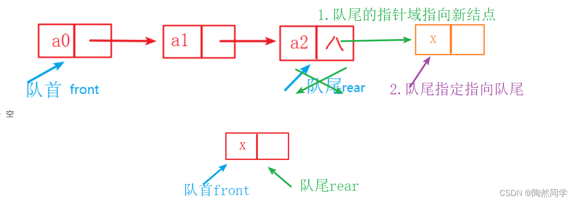 rear.next = s;          //队尾指针域next,指向新结点