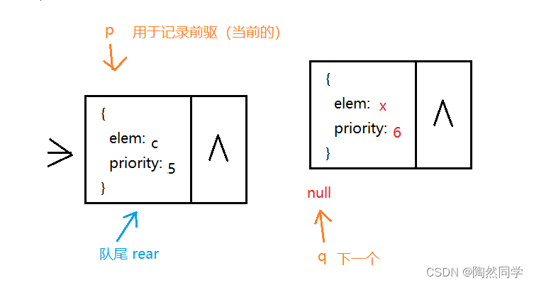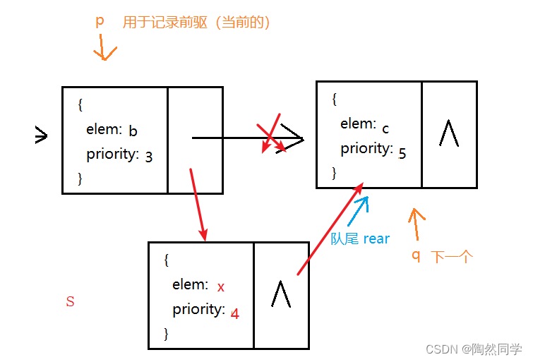 -  情况1:队首插入(p如果指向队首front,表示新结点优先级的数字小) ![]()
