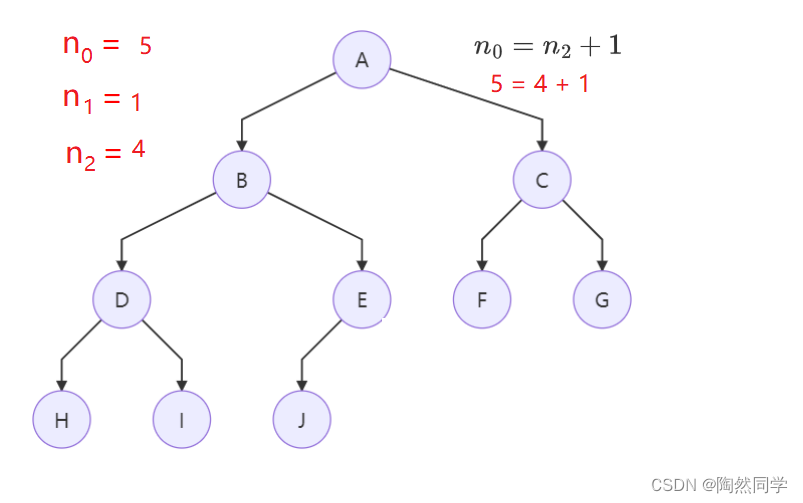& n_1 度为1的结点个数 ,n 总结点个数,e分支的个数 \\ n = n_0 + n_1 + n_2 & 总数 = 叶结点 + 度为1结点 + 度为2结点 \\ e = n_1 + 2 × n_2 & 度为1结点有1个分支,度为2的结点有2个分支 \\ n = e + 1 & 除了根结点,其他每个结点均对应一个进入它的分值 \\ n_0 = n_2 + 1