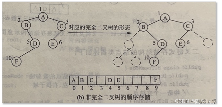 先在树中增加一些并不存在的虚结点并使其成为一棵完全二叉树,然后用与完全二叉树相同的方法对结点进行编号,再将编号为i的结点的值存放到数组下标为i的数组单元中,虚结点不存放任何值。