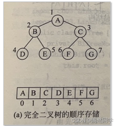 用一组地址连续的存储单元从根结点开始依次自上而下,并按层次从左到右存储完全二叉树上的各节点元素,即将完全二叉树编号为i的结点元素存储在下标为i数组元素中。