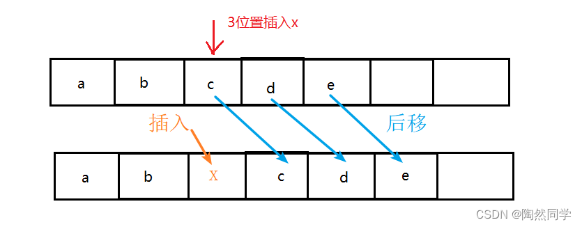 顺序表插入操作:将第i个数据元素及其之后的所有的数据元素,后移一个存储位置,再将新元素插入到i处。