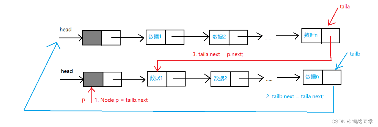Node p = tailb.next; //记录b尾的指向,也就是b头