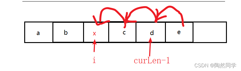 public void remove(int i ) throws Exception { // 0.1 校验非法数据 if(i < 0 || i > curLen - 1 ) { throw new Exception("位置非法"); } // 1 将i之后向前移动 for(int j = i ; j < curLen - 1 ; j ++ ) { listEle[j] = listEle[j+1]; } // 2 长度减一 curLen--; } -