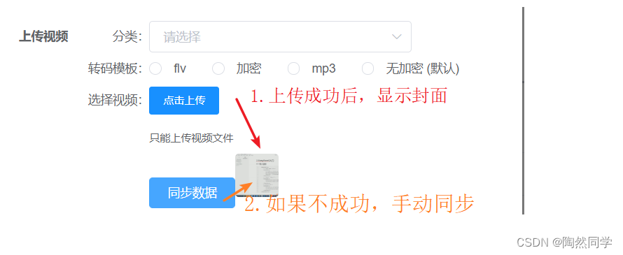 <el-col :span="20"> <!-- 上传组件 --> <el-upload class="upload-demo" :action="uploadUrl" :before-upload="beforeVideoUpload" :on-success="videoUploadSuccess" :file-list="videoFileList" :limit="1"> <el-button size="small" type="primary">点击上传</el-button> <div slot="tip" class="el-upload__tip">只能上传视频文件</div> </el-upload> <el-button type="primary" @click="findVodVideoInfo">同步数据</el-button> <el-avatar shape="square" :size="50" :src="video.coverURL"></el-avatar> <br/> {{video}} </el-col> -