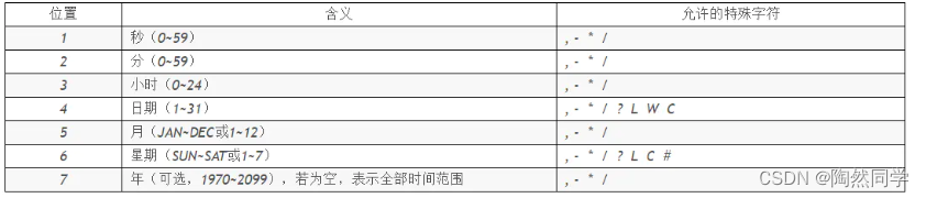 "30 * * * * ?" 第30秒触发任务 "30 10 * * * ?" 每小时的10分30秒触发任务 "30 10 1 * * ?" 每天1点10分30秒触发任务 "30 10 1 20 * ?" 每月20号1点10分30秒触发任务 "30 10 1 20 10 ? *" 每年10月20号1点10分30秒触发任务 "30 10 1 20 10 ? 2011" 2011年10月20号1点10分30秒触发任务 "30 10 1 ? 10 * 2011" 2011年10月每天1点10分30秒触发任务 "30 10 1 ? 10 SUN 2011" 2011年10月每周日1点10分30秒触发任务 "15,30,45 * * * * ?" 每15秒,30秒,45秒时触发任务 "15-45 * * * * ?" 15到45秒内,每秒都触发任务 "15/5 * * * * ?" 每分钟的每15秒开始触发,每隔5秒触发一次 "15-30/5 * * * * ?" 每分钟的15秒到30秒之间开始触发,每隔5秒触发一次 "0 0/3 * * * ?" 每小时的第0分0秒开始,每三分钟触发一次 "0 15 10 ? * MON-FRI" 星期一到星期五的10点15分0秒触发任务 "0 15 10 L * ?" 每个月最后一天的10点15分0秒触发任务 "0 15 10 LW * ?" 每个月最后一个工作日的10点15分0秒触发任务 "0 15 10 ? * 5L" 每个月最后一个星期四的10点15分0秒触发任务 "0 15 10 ? * 5#3" 每个月第三周的星期四的10点15分0秒触发任务