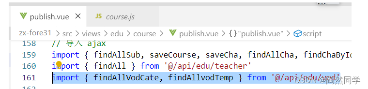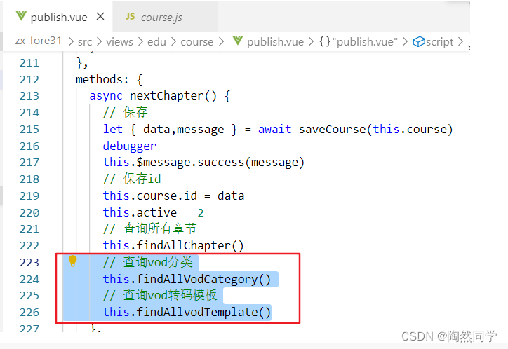 async nextChapter() { // 保存 let { data,message } = await saveCourse(this.course) debugger this.$message.success(message) // 保存id this.course.id = data this.active = 2 // 查询所有章节 this.findAllChapter() // 查询vod分类 this.findAllVodCategory() // 查询vod转码模板 this.findAllvodTemplate() },