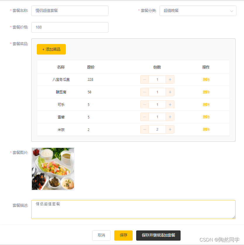 新增套餐,其实就是将新增页面录入的套餐信息插入到setmeal表,还需要向setmeal_dish表插入套餐和菜品关联数据。所以在新增套餐时,涉及到两个表: