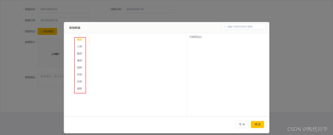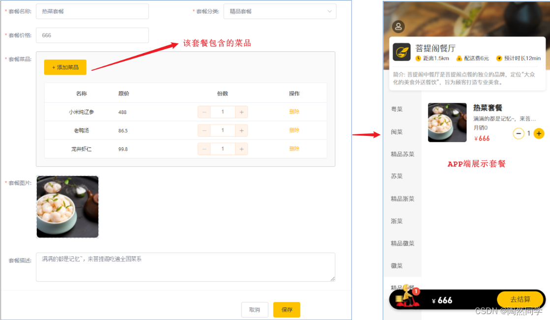 后台系统中可以管理套餐信息,通过新增套餐功能来添加一个新的套餐,在添加套餐时需要选择当前套餐所属的套餐分类和包含的菜品,并且需要上传套餐对应的图片,在移动端会按照套餐分类来展示对应的套餐。
