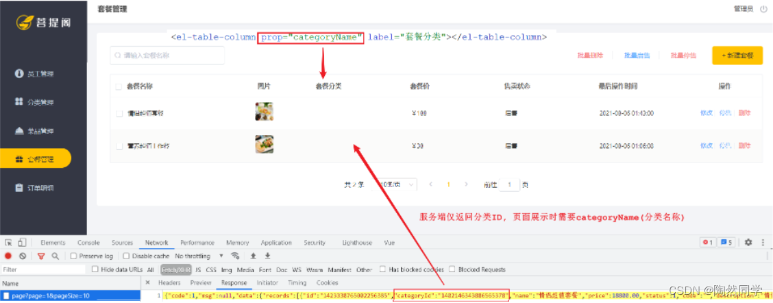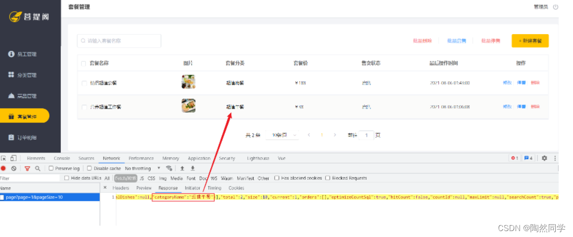 代码完善后,重启服务,测试列表查询,我们发现, 抓取浏览器的请求响应数据,我们可以获取到套餐分类名称categoryName,也可以在列表页面展示出来 。