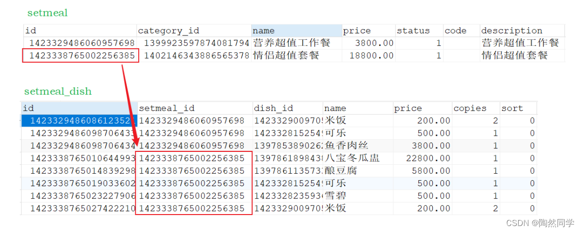 3). 删除已经停售的套餐信息,执行删除之后, 检查数据库表结构 setmeal , setmeal_dish表中的数据