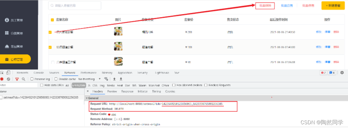 观察删除单个套餐和批量删除套餐的请求信息可以发现,两种请求的地址和请求方式都是相同的,不同的则是传递的id个数,所以在服务端可以提供一个方法来统一处理。