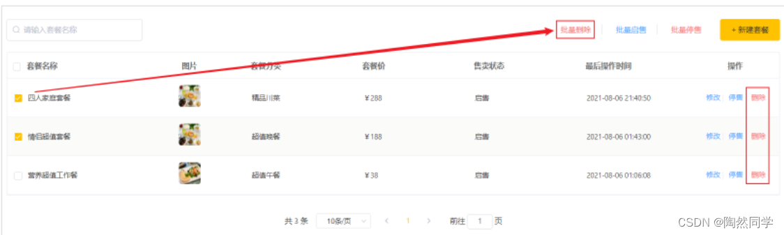 1). 点击删除, 删除单个套餐时,页面发送ajax请求,根据套餐id删除对应套餐