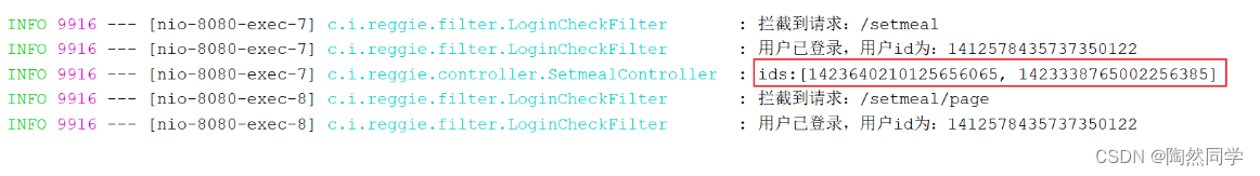 编写完代码,我们重启服务之后,访问套餐列表页面,勾选复选框,然后点击"批量删除",我们可以看到服务端可以接收到集合参数ids,并且在控制台也可以输出对应的数据 。