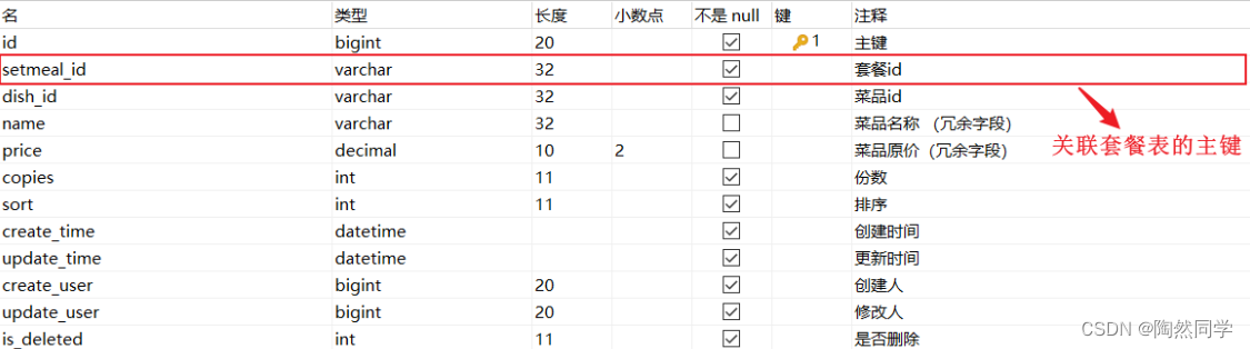 在该表中,菜品的名称name,菜品的原价price 实际上都是冗余字段,因为我们在这张表中存储了菜品的ID(dish_id),根据该ID我们就可以查询出name,price的数据信息,而这里我们又存储了name,price,这样的话,我们在后续的查询展示操作中,就不需要再去查询数据库获取菜品名称和原价了,这样可以简化我们的操作。