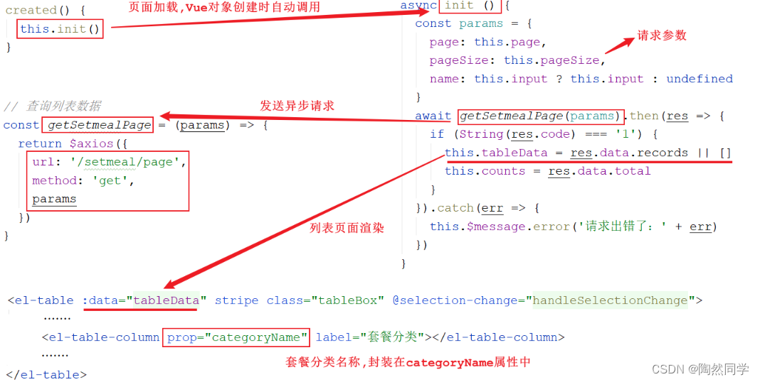 基本分页查询代码编写完毕后,重启服务,测试列表查询,我们发现, 列表页面的数据可以展示出来, 但是套餐分类名称没有展示出来。
