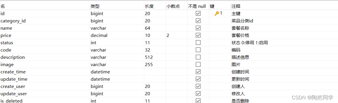 | setmeal | 套餐表 | 存储套餐的基本信息 |