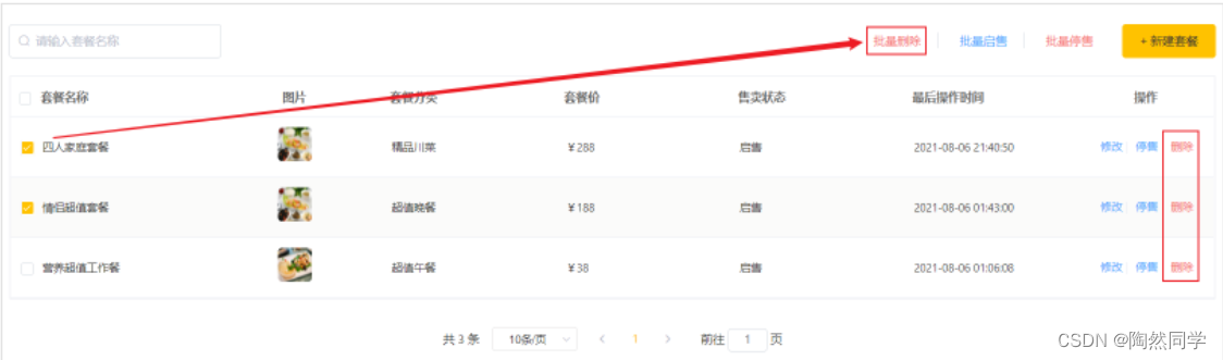 在套餐管理列表页面,点击删除按钮,可以删除对应的套餐信息。也可以通过复选框选择多个套餐,点击批量删除按钮一次删除多个套餐。注意,对于状态为售卖中的套餐不能删除,需要先停售,然后才能删除。