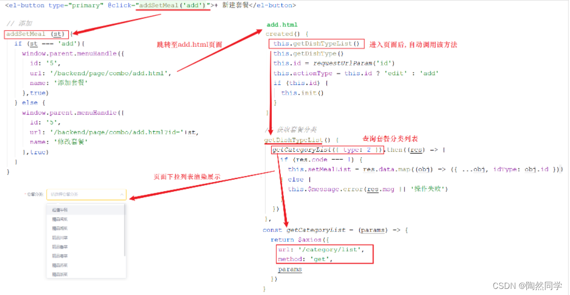 1). 点击新建套餐按钮,访问页面(backend/page/combo/add.html),页面加载发送ajax请求,请求服务端获取套餐分类数据并展示到下拉框中(==已实现==)