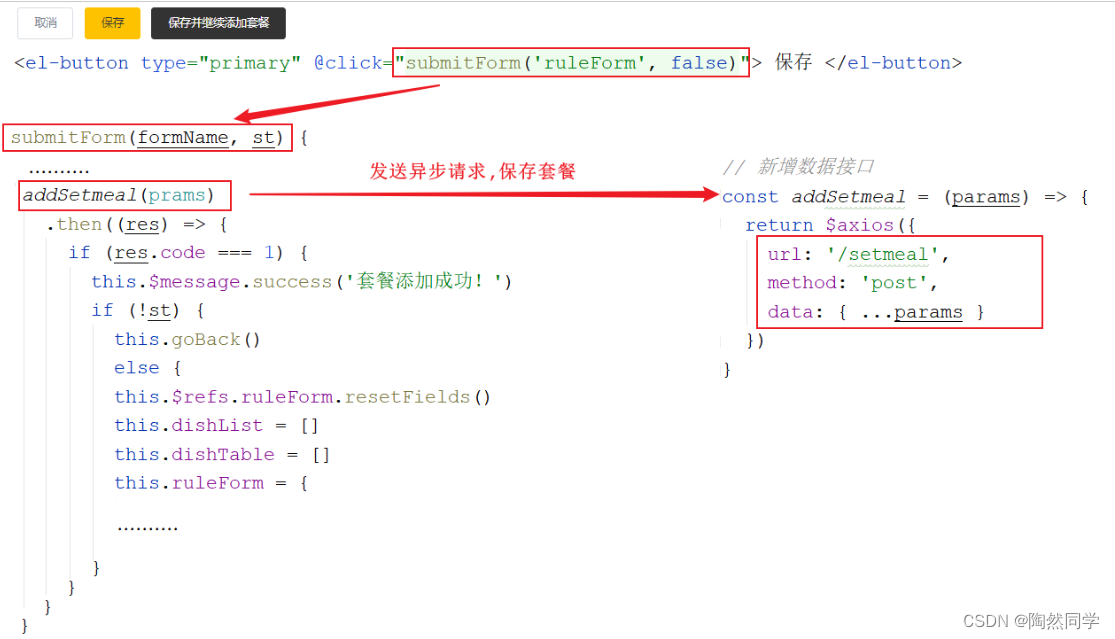 服务端的基础准备工作我们准备完毕之后,在进行代码开发之前,需要梳理一下新增套餐时前端页面和服务端的交互过程: