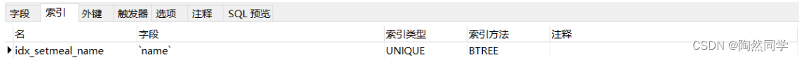 在该表中,套餐名称name字段是不允许重复的,在建表时,已经创建了唯一索引。