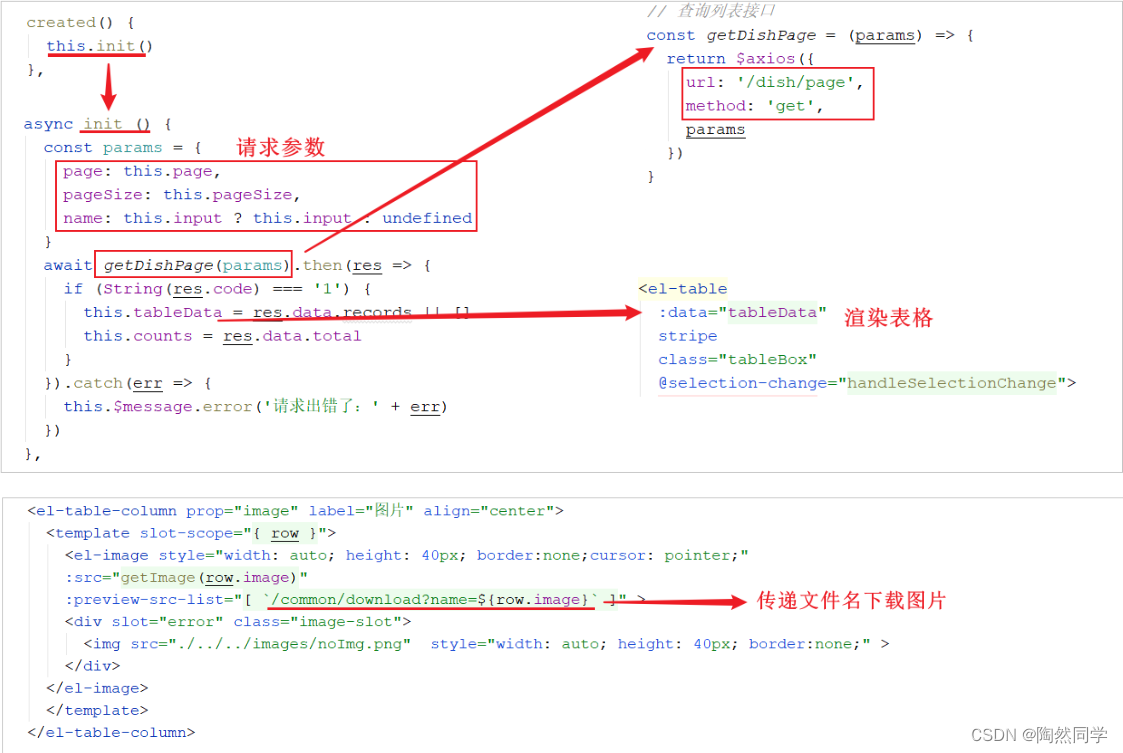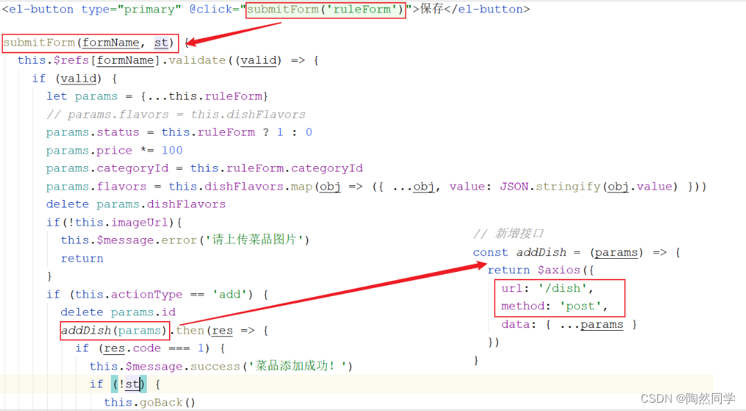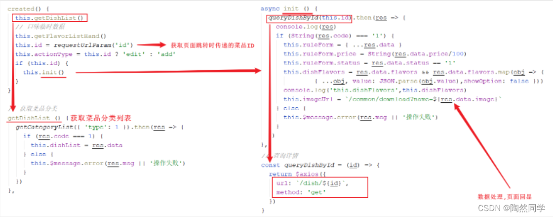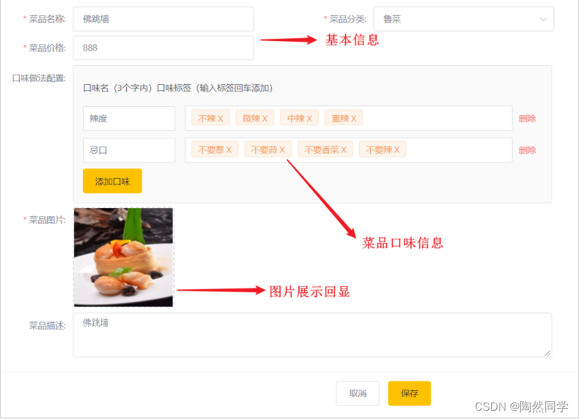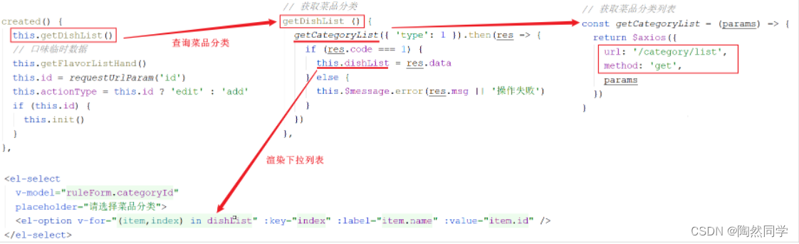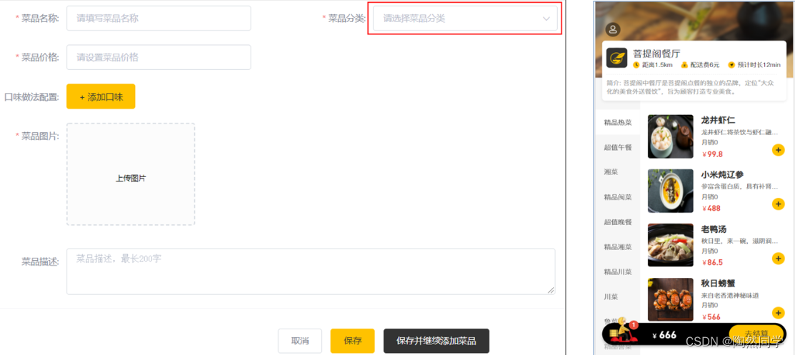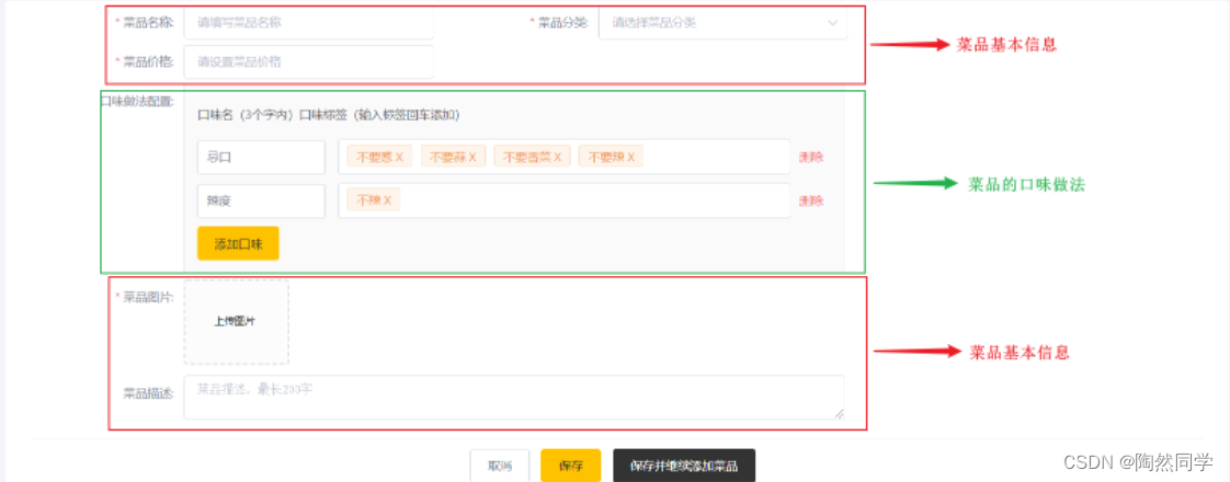 经过上述的分析,我们发现,菜品分类下拉框的展示、图片的下载回显功能我们都已经实现了。我们只需要在这里实现两个功能即可,分别是: