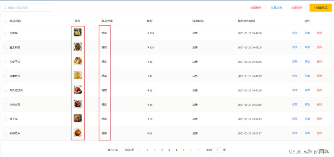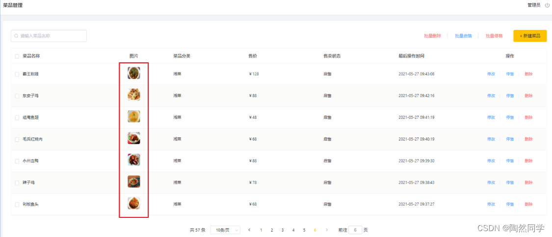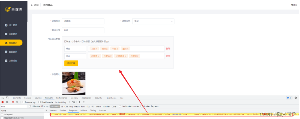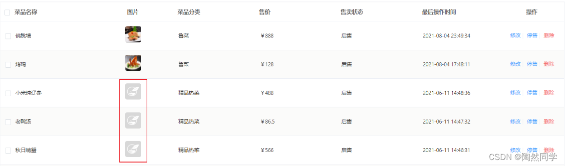 这是因为我们在导入sql脚本时,导入了一部分菜品的数据,而菜品的图片在我们的磁盘目录中并不存在,所以才会出现图片展示不出来的情况,而我们后续自己添加的菜品信息是没有问题的。