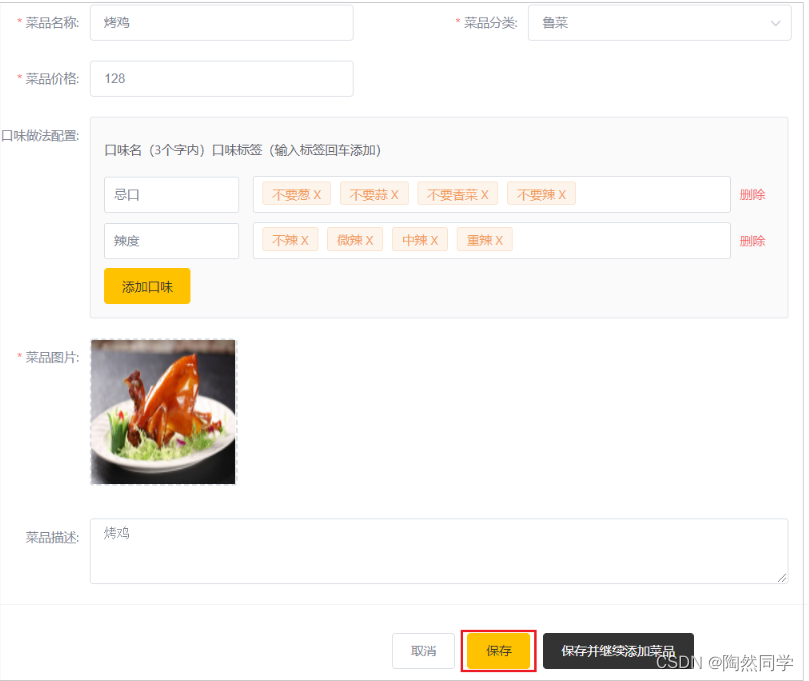 5). 点击保存按钮,页面发送ajax请求,将修改后的菜品相关数据以json形式提交到服务端