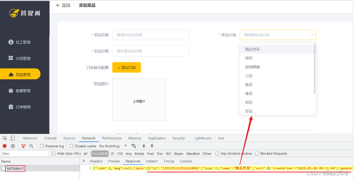 2). 进入add.html,页面发送ajax请求,请求服务端获取分类数据,用于菜品分类下拉框中数据展示(已实现)