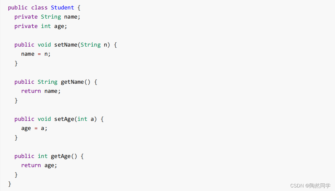2. 提供 getXxx 方法 / setXxx 方法,可以访问成员变量,代码如下: