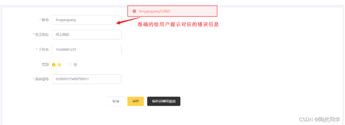 当我们在测试中,添加用户时, 输入了一个已存在的用户名时,前端界面出现错误提示信息: