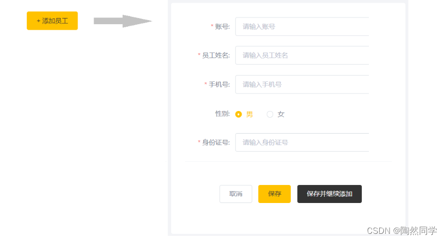 后台系统中可以管理员工信息,通过新增员工来添加后台系统用户。点击[添加员工]按钮跳转到新增页面,如下: