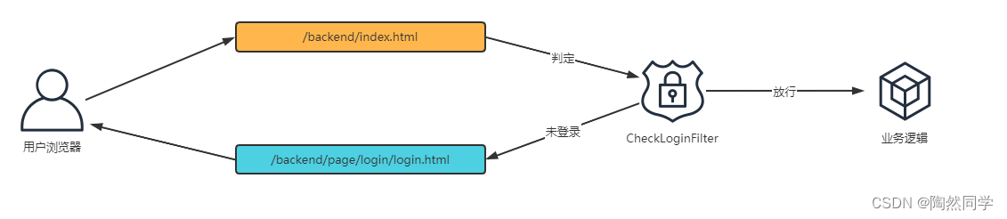 可以使用我们之前讲解过的 过滤器、拦截器来实现,在过滤器、拦截器中拦截前端发起的请求,判断用户是否已经完成登录,如果没有登录则返回提示信息,跳转到登录页面。