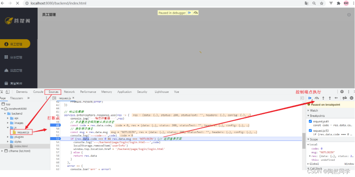F12打开浏览器的调试工具, 找到我们前面提到的request.js, 在request.js的响应拦截器位置打上断点。