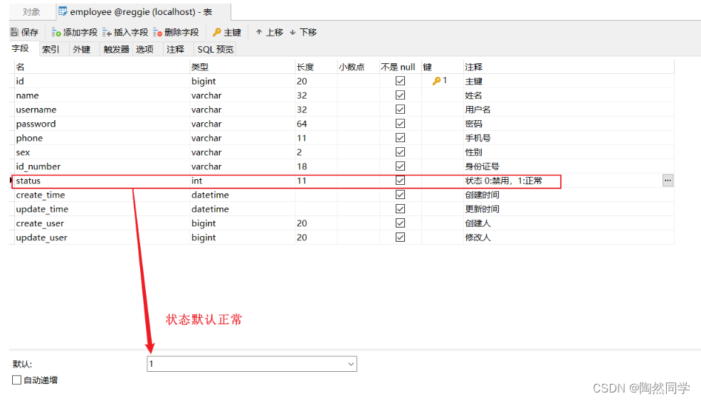 新增员工,其实就是将我们新增页面录入的员工数据插入到employee表。employee表中的status字段已经设置了默认值1,表示状态正常。