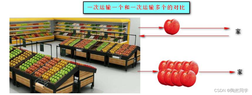 好比:我们去超市买水果,若买一个带回家一个,那么效率很低,不如买完一次性打包带回家更方便。