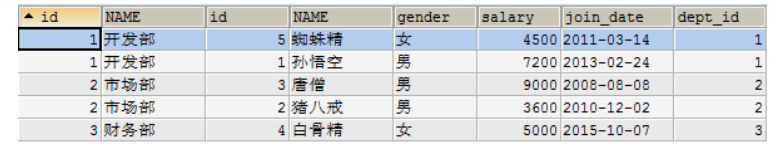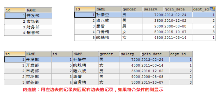 SELECT * FROM dept INNER JOIN emp ON emp.`dept_id`=dept.`id`;