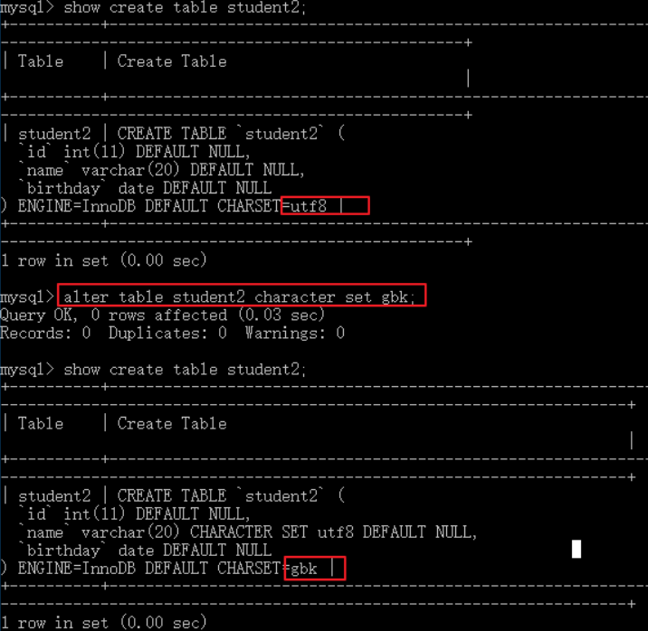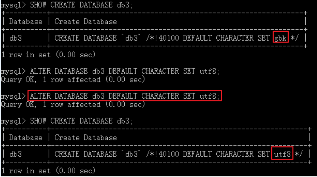 CREATE DATABASE db2 CHARACTER SET gbk;ALTER DATABASE db3 DEFAULT CHARACTER SET utf8;