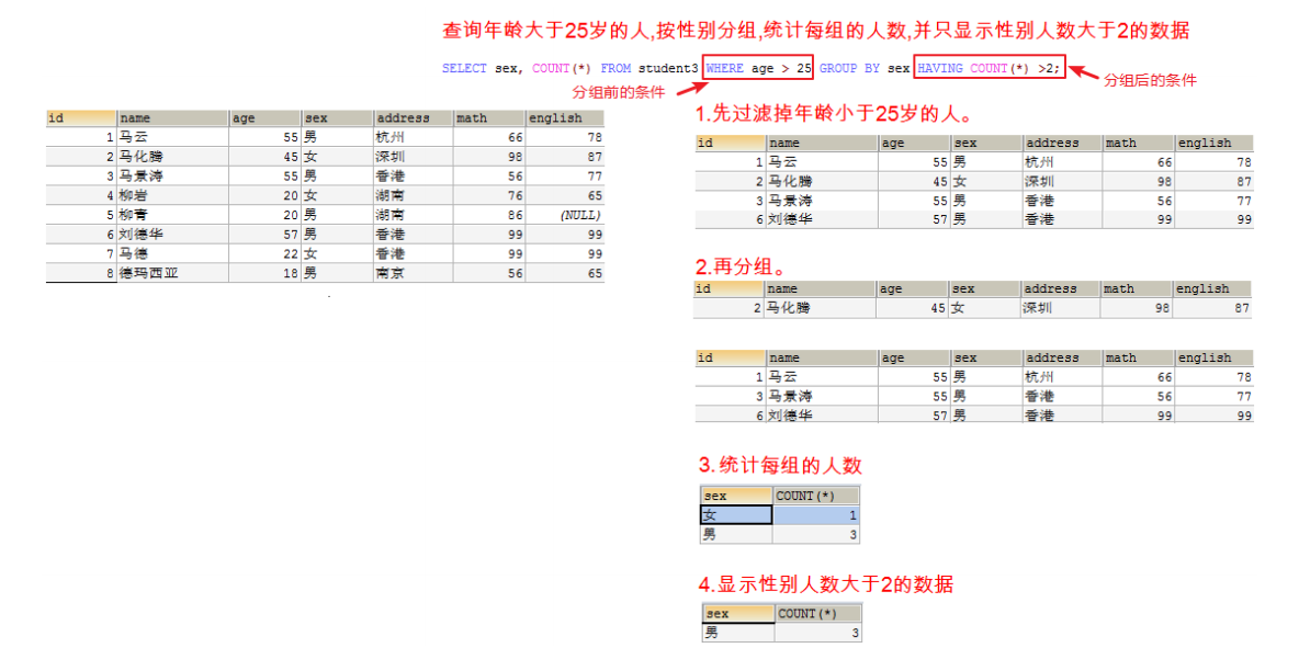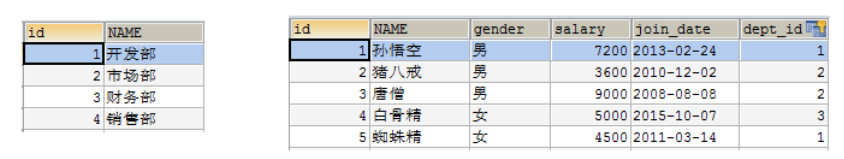 同时查询多张表获取到需要的数据 比如:我们想查询到开发部有多少人,需要将部门表和员工表同时进行查询