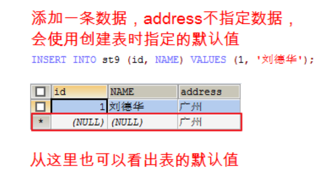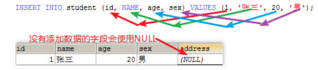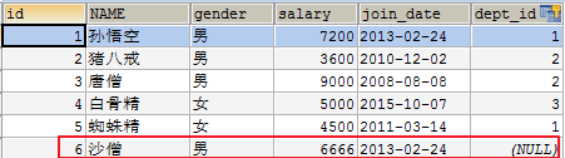 在员工表中增加一个员工 INSERT INTO emp(NAME,gender,salary,join_date,dept_id) VALUES('沙僧','男',6666,'2013-02-24',NULL);
