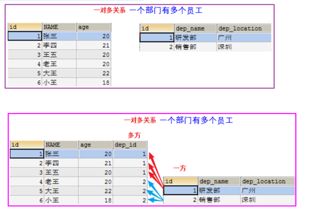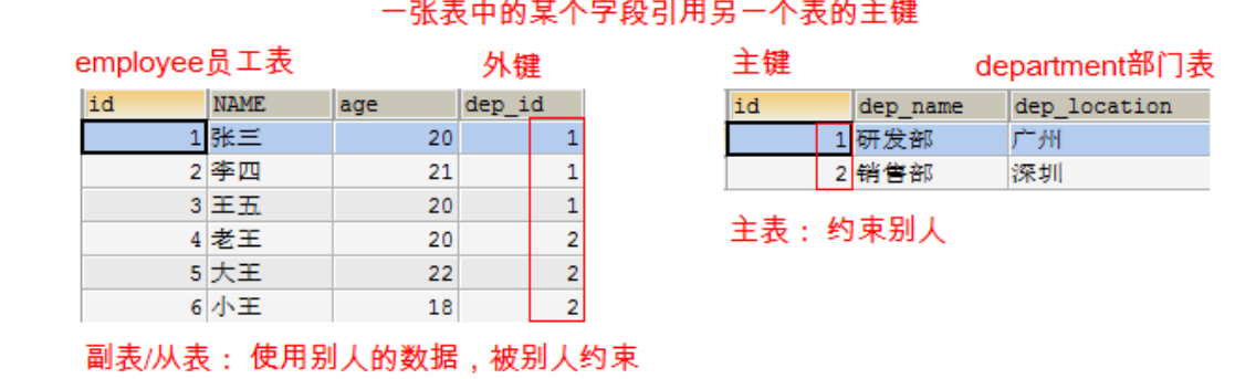 ‐‐ 添加一个外键 ‐‐ 外键取名公司要求,一般fk结尾 CONSTRAINT emp_depid_ref_dep_id_fk FOREIGN KEY(dep_id) REFERENCES department(id)