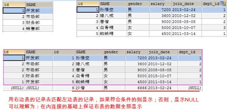 右外连接:使用RIGHT OUTER JOIN ... ON,OUTER可以省略 SELECT 字段名 FROM 左表 RIGHT OUTER JOIN 右表ON 条件; 用右边表的记录去匹配左边表的记录,如果符合条件的则显示;否则,显示NULL 可以理解为:在内连接的基础上保证右表的数据全部显示