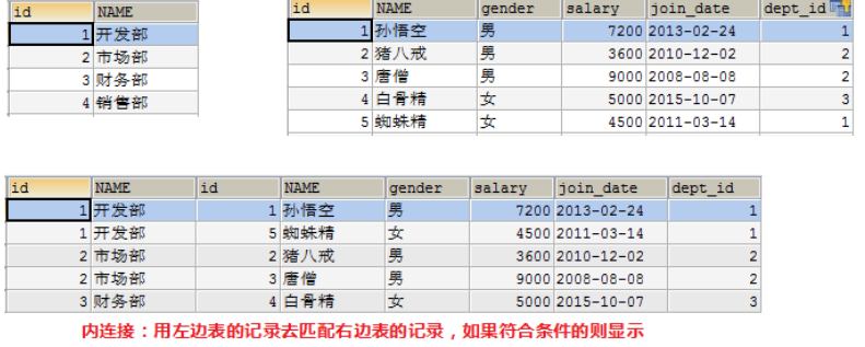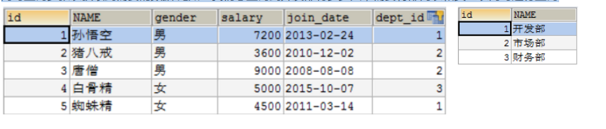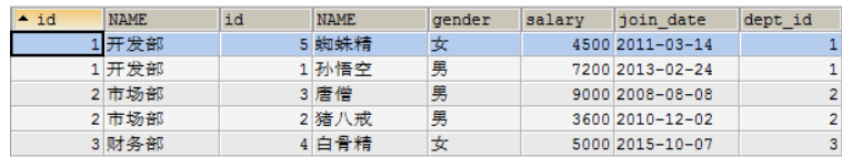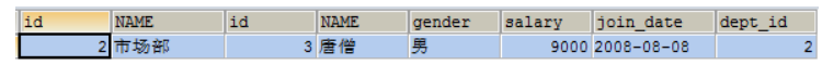 具体操作:查询唐僧的信息,显示员工id,姓名,性别,工资和所在的部门名称,我们发现需要联合2张表同时才能查询出需要的数据,我们使用内连接