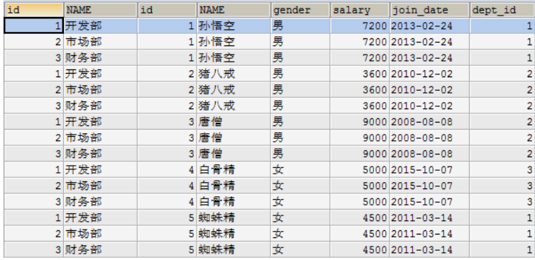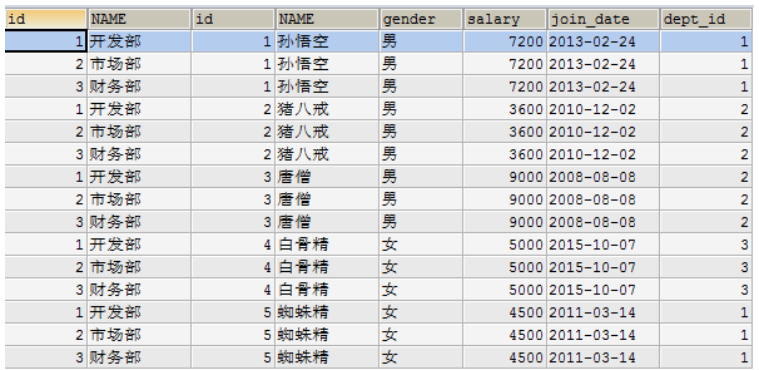 以上数据其实是左表的每条数据和右表的每条数据组合。左表有3条,右表有5条,最终组合后3*5=15条数据。