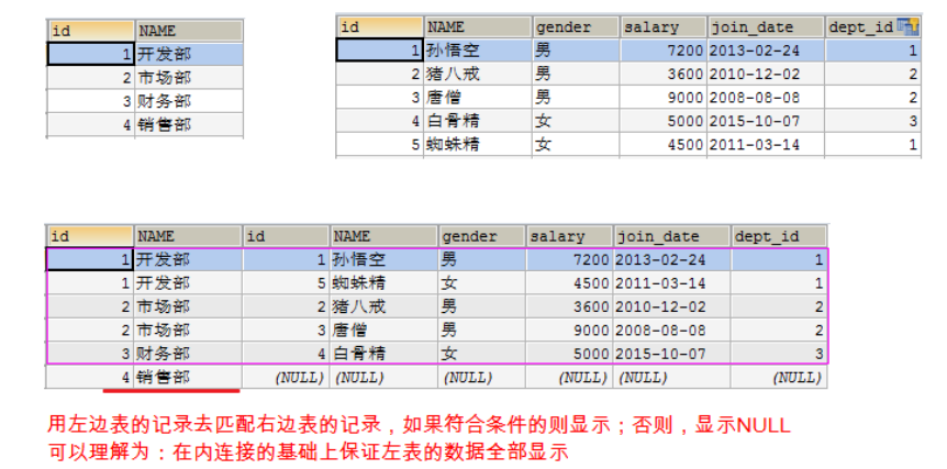左外连接:使用LEFT OUTER JOIN ... ON,OUTER可以省略 SELECT 字段名 FROM 左表 LEFT OUTER JOIN 右表 ON条件; 用左边表的记录去匹配右边表的记录,如果符合条件的则显示;否则,显示NULL 可以理解为:在内连接的基础上保证左表的数据全部显示