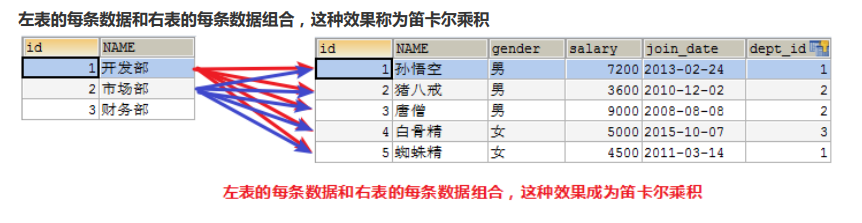 多表查询时左表的每条数据和右表的每条数据组合,这种效果成为笛卡尔积需求:查询每个部门有哪些人具体操作: